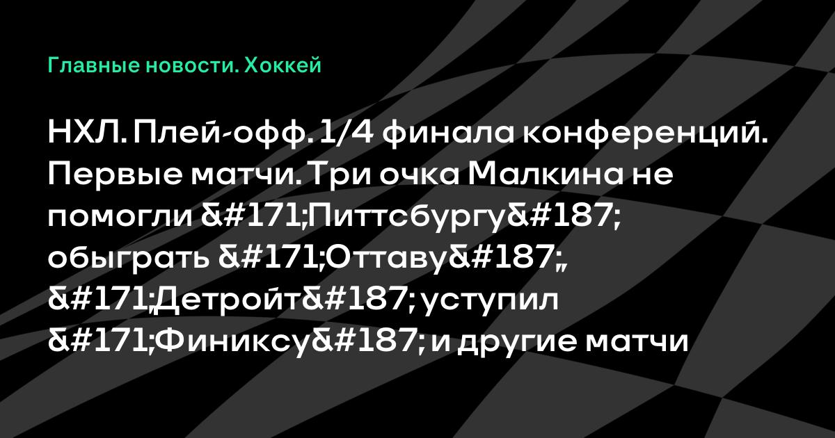 НХЛ. Плей-офф. 1/4 финала конференций. Первые матчи. Три очка Малкина не помогли «Питтсбургу» обыграть «Оттаву», «Детройт» уступил «Финиксу» и другие матчи