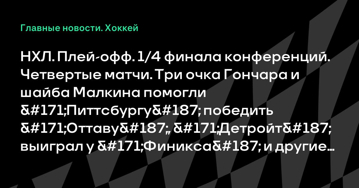 НХЛ. Плей-офф. 1/4 финала конференций. Четвертые матчи. Три очка Гончара и шайба Малкина помогли «Питтсбургу» победить «Оттаву», «Детройт» выиграл у «Финикса» и другие результаты