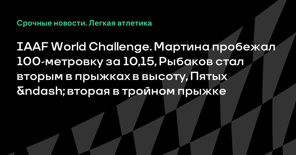 IAAF World Challenge. Мартина пробежал 100-метровку за 10,15, Рыбаков стал вторым в прыжках в высоту, Пятых – вторая в тройном прыжке