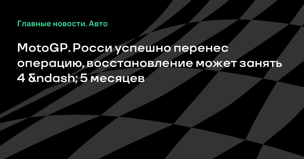 Пилот «Ямахи» Валентино Росси, получивший серьезную травму во время аварии в Мюджелло, успешно перенес трехчасовую операцию в местном госпитале. По сообщению La Gazzetta dello Sport, срок восстановления, ранее оценивавшийся в 2 3 месяца, будет составлять 4 5 месяцев. Тем не менее, даже этот срок пока является предварительным и будет уточнен после более полной оценки состояния гонщика.