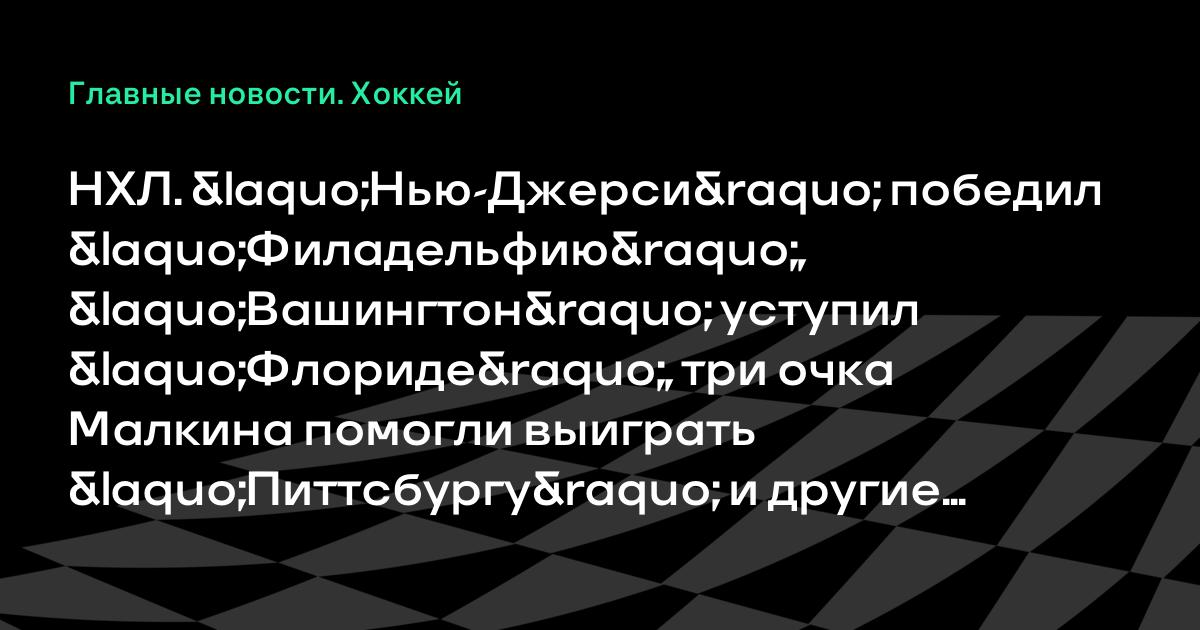 НХЛ. «Нью-Джерси» победил «Филадельфию», «Вашингтон» уступил «Флориде», три очка Малкина помогли выиграть «Питтсбургу» и другие результаты