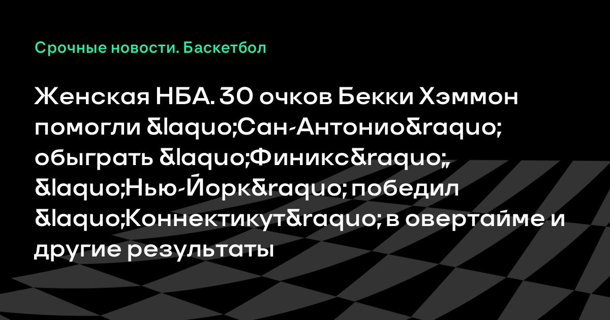 Женская НБА. 30 очков Бекки Хэммон помогли «Сан-Антонио» обыграть «Финикс», «Нью-Йорк» победил «Коннектикут» в овертайме и другие результаты