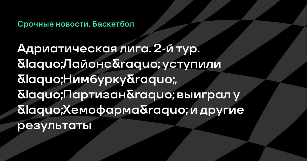 Адриатическая лига. 2-й тур. «Лайонс» уступили «Нимбурку», «Партизан» выиграл у «Хемофарма» и другие результаты