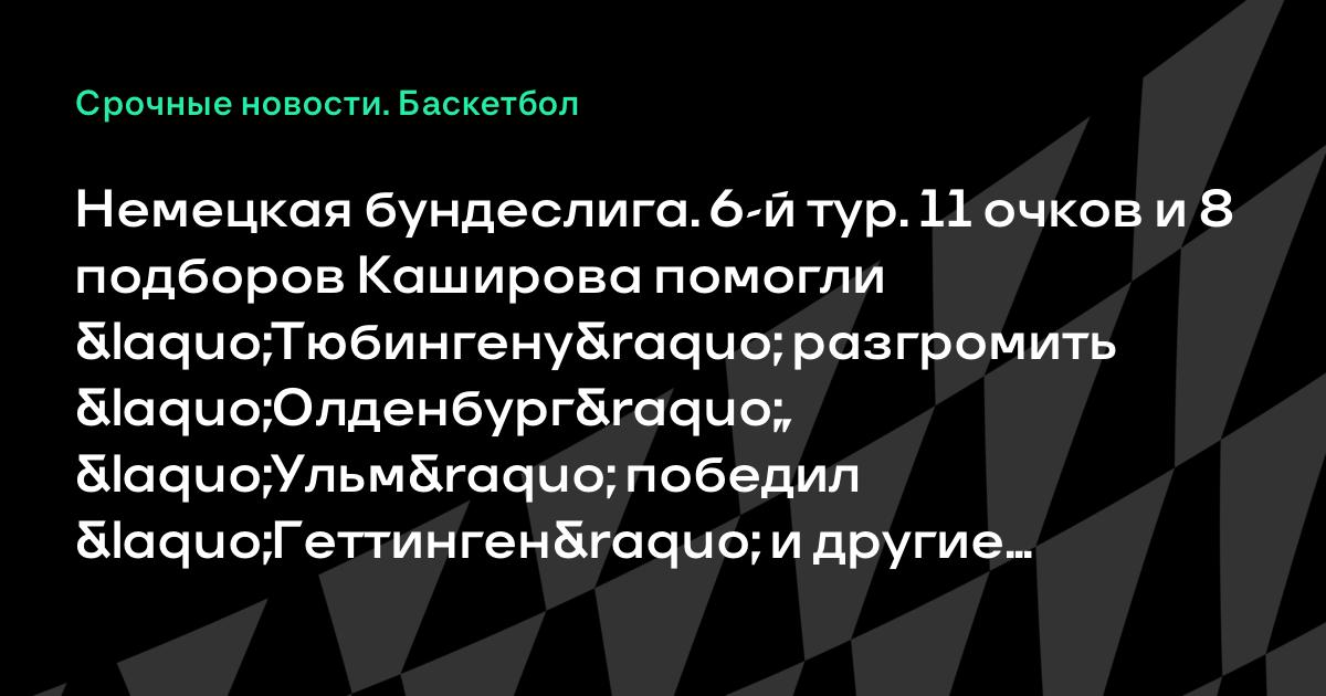 Немецкая бундеслига. 6-й тур. 11 очков и 8 подборов Каширова помогли «Тюбингену» разгромить «Олденбург», «Ульм» победил «Геттинген» и другие результаты
