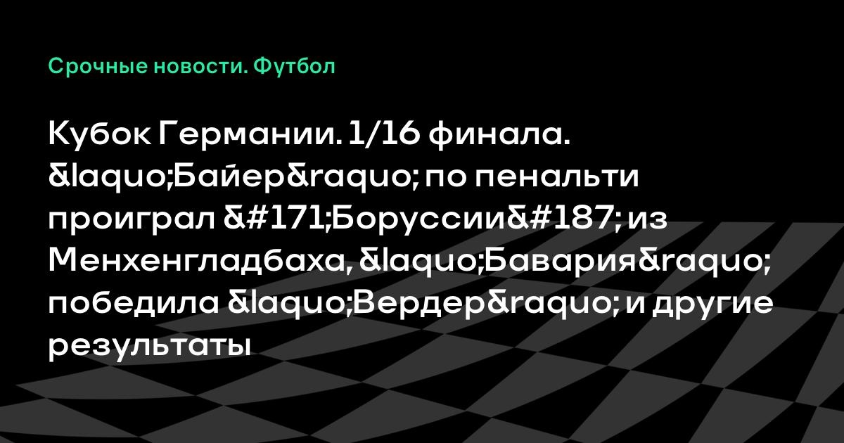 Кубок Германии. 1/16 финала. «Байер» по пенальти проиграл «Боруссии» из Менхенгладбаха, «Бавария» победила «Вердер» и другие результаты
