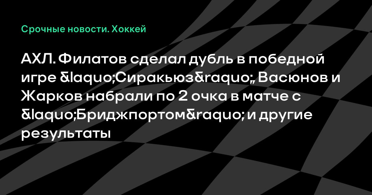 АХЛ. Филатов сделал дубль в победной игре «Сиракьюз», Васюнов и Жарков набрали по 2 очка в матче с «Бриджпортом» и другие результаты