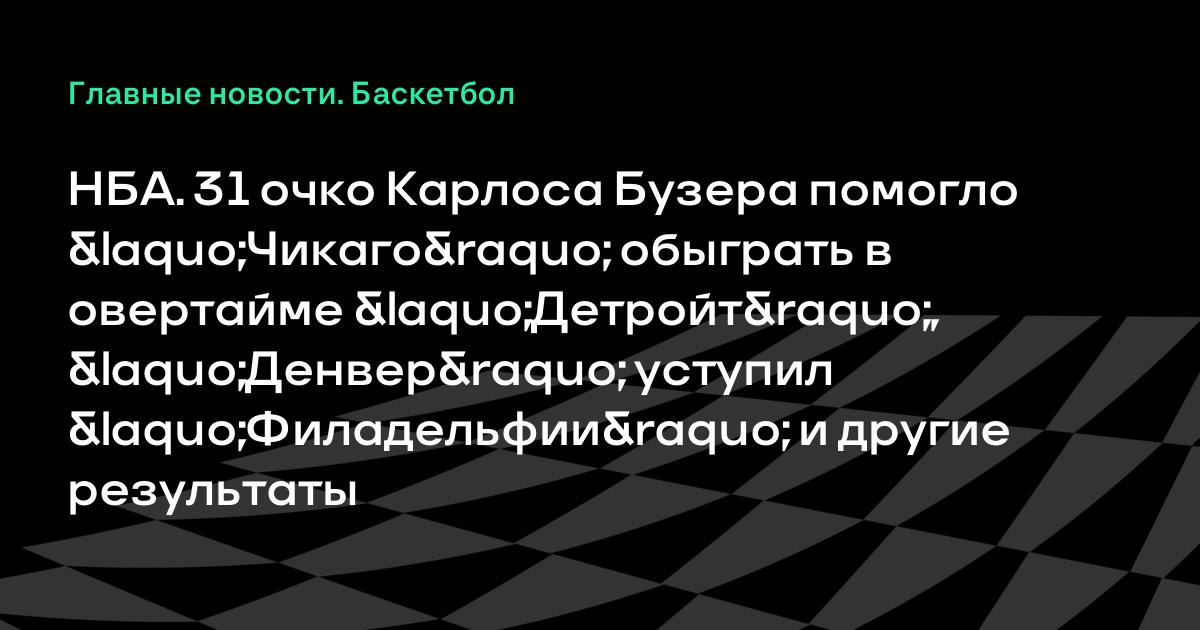 НБА. 31 очко Карлоса Бузера помогло «Чикаго» обыграть в овертайме «Детройт», «Денвер» уступил «Филадельфии» и другие результаты