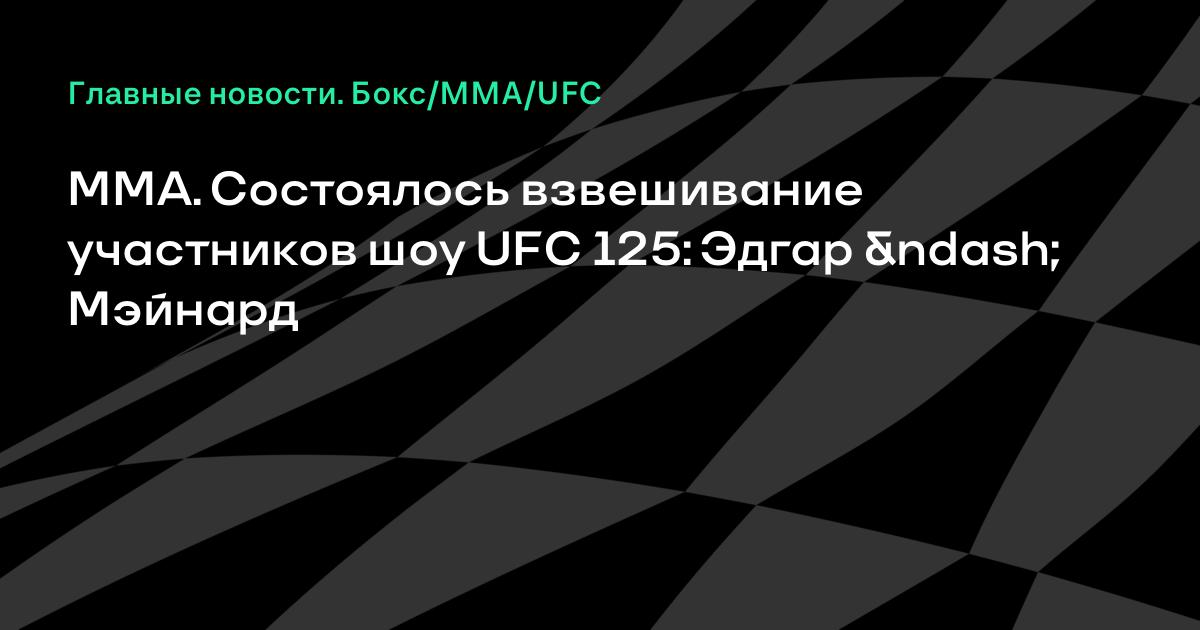 В Лас-Вегасе (США) состоялась процедура взвешивания участников шоу UFC 125, в главном поединке которого встретятся чемпион организации в легком весе Фрэнки Эдгар (70.31 кг/155 фунтов) и претендент Грэй Мэйнард (70.31 кг/155 фунтов). Соперники проведут матч-реванш: в 2008 году Мэйнард победил Эдгара единогласным решением судей.