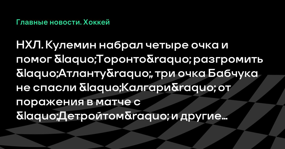 НХЛ. Кулемин набрал четыре очка и помог «Торонто» разгромить «Атланту», три очка Бабчука не спасли «Калгари» от поражения в матче с «Детройтом» и другие результаты