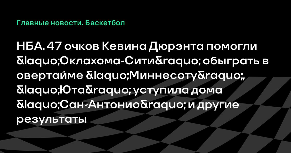 НБА. 47 очков Кевина Дюрэнта помогли «Оклахома-Сити» обыграть в овертайме «Миннесоту», «Юта» уступила дома «Сан-Антонио» и другие результаты