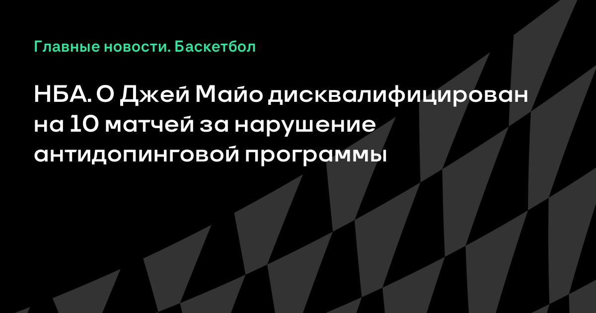 Защитник «Мемфиса» О Джей Майо дисквалифицирован на 10 матчей за нарушение антидопинговой программы. Как информирует официальный сайт лиги, основанием для этого стала положительная проба на дегидроэпиандростерон (DHEA, ДГЭА).