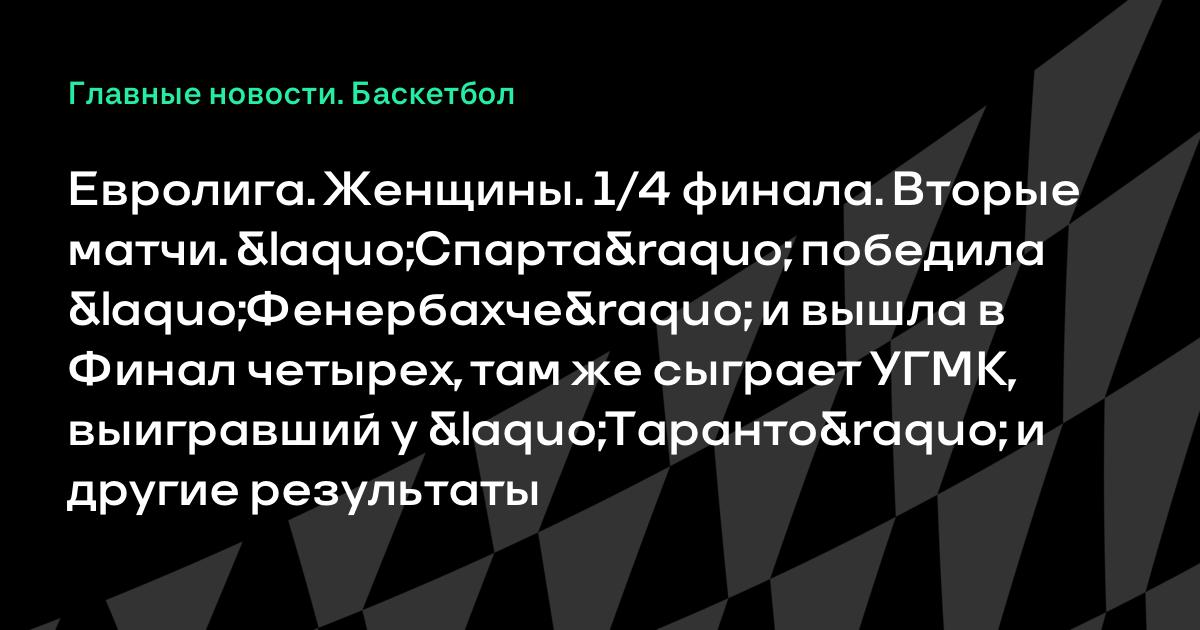 Евролига. Женщины. 1/4 финала. Вторые матчи. «Спарта» победила «Фенербахче» и вышла в Финал четырех, там же сыграет УГМК, выигравший у «Таранто» и другие результаты