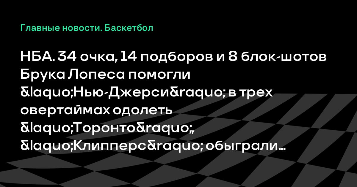 НБА. 34 очка, 14 подборов и 8 блок-шотов Брука Лопеса помогли «Нью-Джерси» в трех овертаймах одолеть «Торонто», «Клипперс» обыграли «Денвер» и другие результаты