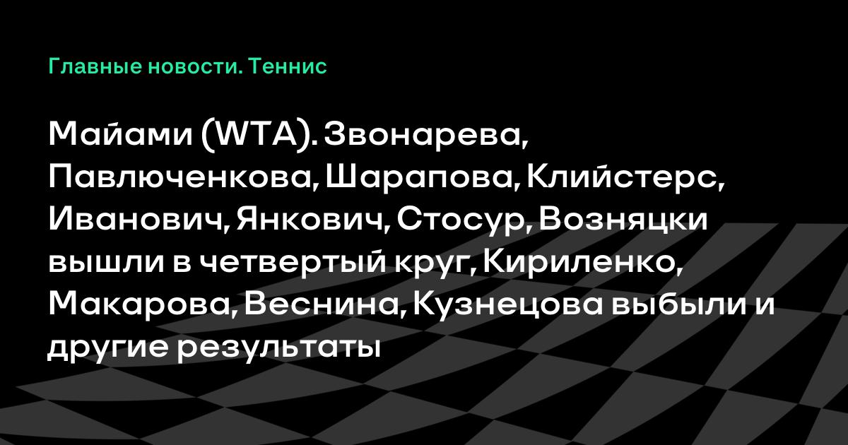 Майами (WTA). Звонарева, Павлюченкова, Шарапова, Клийстерс, Иванович, Янкович, Стосур, Возняцки вышли в четвертый круг, Кириленко, Макарова, Веснина, Кузнецова выбыли и другие результаты
