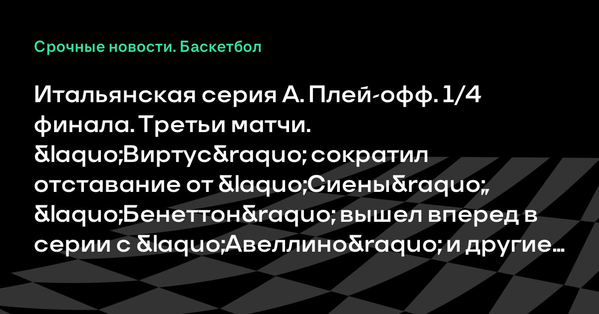 Итальянская серия А. Плей-офф. 1/4 финала. Третьи матчи. «Виртус» сократил отставание от «Сиены», «Бенеттон» вышел вперед в серии с «Авеллино» и другие результаты