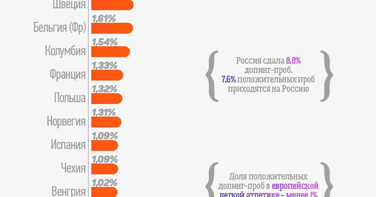 27 июля 2016, 11:28 Допинг вины. Кто попадался на веществах чаще России Наглядное отображение доклада Ричарда Макларена. Демиург красивых картинок – Павел Сторчилов Автор Данил Тармасинов Этот пост опубликован в блоге на Трибуне Sports.ru. Присоединяйтесь к крупнейшему сообществу спортивных болельщиков! Другие посты блога Инфографика WADA допинг Рио-2016