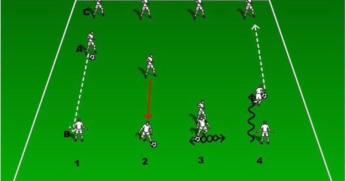 Игрок А выполняет короткое ведение, после чего отдает передачу и становится защитником. Игрок В получивший мяч, разворачивается на 90 градусов, убирает мяч под дальнюю ногу и укрывает мяч корпусом. Защитник препятствует проходу нападающего, нападающий должен развернуться лицом к третьему игроку обыграв защитника, после чего делает передачу игроку С и повторяет роль обороняющегося.