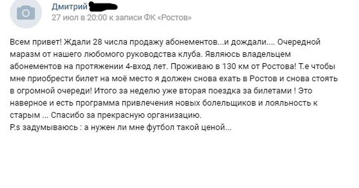 Но в клубе решили, что даже с такими ценами болельщики пойдут на стадион и заполнят его, нужно было придумать что-то ещё, чтобы отбить у людей желание идти на стадион. И тогда была придумана гениальная идея - все владельцы прошлогодних абонементов могли выкупить свои места только в кассах при предъявлении абонемента, а те у кого не было абонемента на прошлый сезон могли купить билеты только через Интернет. Такая идея пришлась не всем по душе. Ниже скриншот из официальной группы ''Ростова" вконтакте.