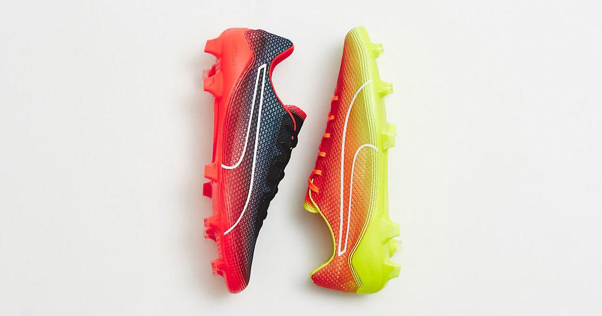 PUMA обновила дизайн модели evoSPEED Fresh, добавив немного «пламенных» изменений. Бутсы весом всего в 124г полностью покрыты в «сигнальный желтый» и «взрывной красный».
