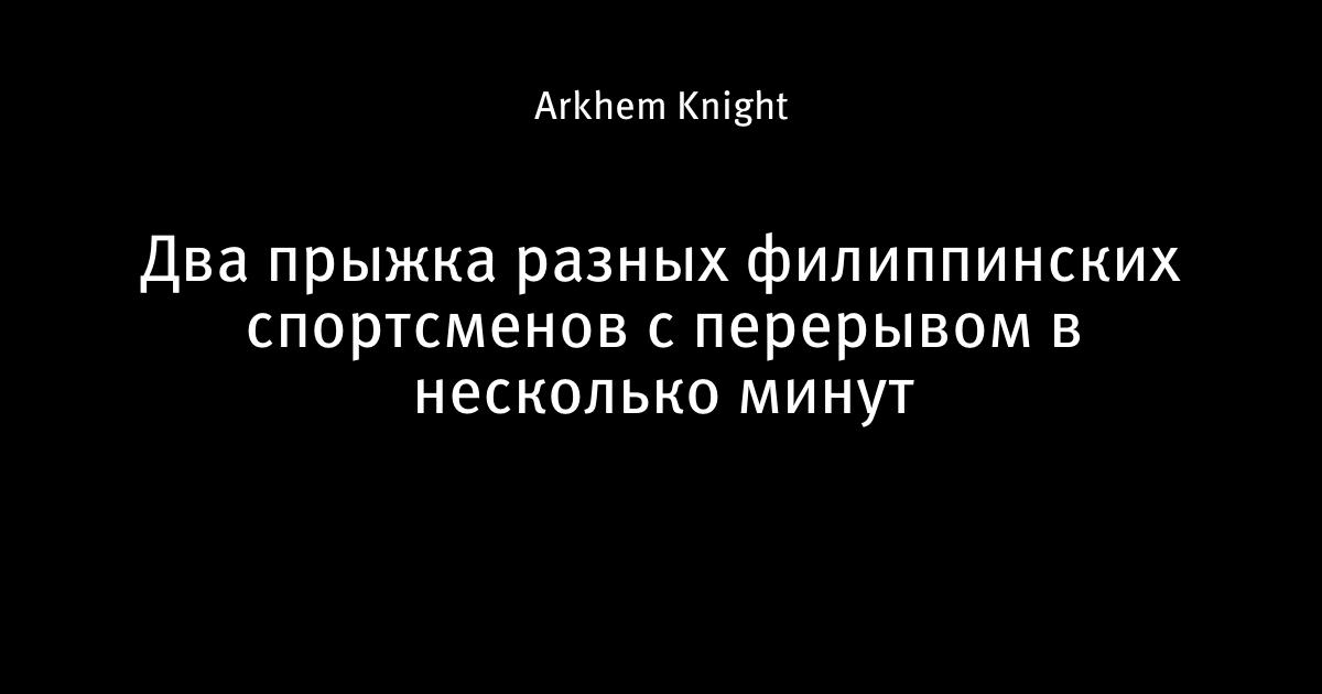 13 августа 2016, 14:55 Два прыжка разных филиппинских спортсменов с перерывом в несколько минут 1 Автор Arkhem Knight Этот пост опубликован в блоге на Трибуне Sports.ru. Присоединяйтесь к крупнейшему сообществу спортивных болельщиков! Другие посты блога Лечебница Аркхем