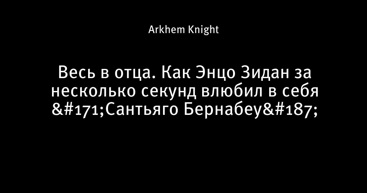 17 августа 2016, 15:36 Весь в отца. Как Энцо Зидан за несколько секунд влюбил в себя «Сантьяго Бернабеу» 1 Автор Arkhem Knight Этот пост опубликован в блоге на Трибуне Sports.ru. Присоединяйтесь к крупнейшему сообществу спортивных болельщиков! Другие посты блога Лечебница Аркхем Энцо Зидан