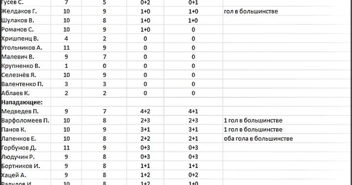 Сразу сошлюсь на некоторые неточности. В матче с Московским Динамо нам не предоставляли списка игроков. От того эта игра засчитана в количество игр только у Александра Шарыченкова и Константина Панова (забившего гол в той игре). Прошу ознакамливаться.