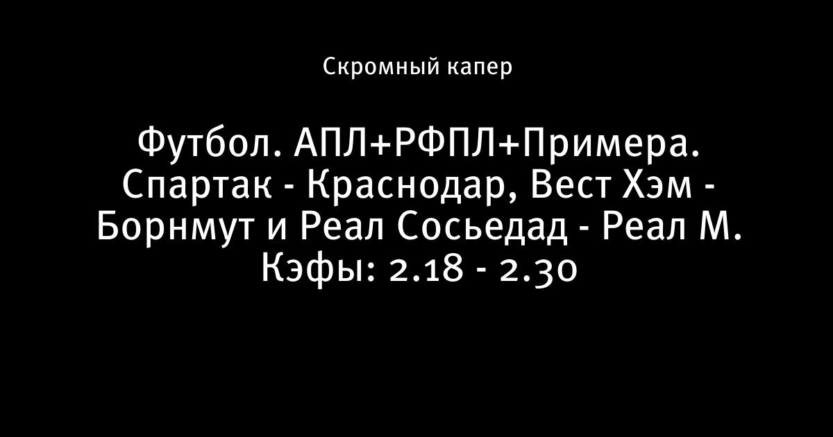 Футбол. АПЛ+РФПЛ+Примера. Спартак - Краснодар, Вест Хэм - Борнмут и Реал Сосьедад - Реал М. Кэфы: 2.18 - 2.30