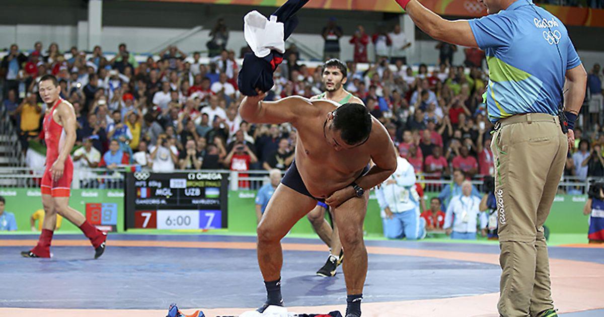 Монгол встречался с Ихтиером Наврузовым из Узбекистана. Схватка заканчивалась со счетом 7:6 в пользу монгола, но последние десять секунд он предпочел бегать по ковру от соперника. Борец и его команда с сиреной начали праздновать бронзу, но на табло загорелся счет 7:7 – судьи выписали технический штраф за пассивную борьбу.