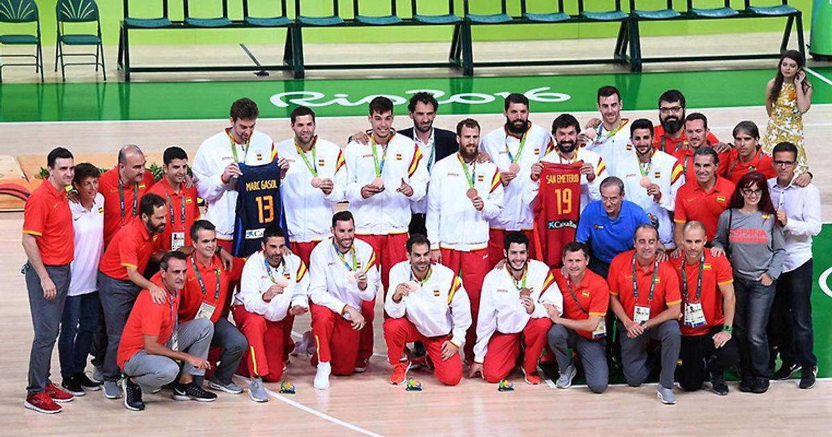 Испанцы вынесли на награждение бронзовыми медалями майки Марка Газоля, пропустившего ОИ из-за травмы, и Фернандо Сан-Эметерио, прошедшего всю подготовку с командой, которому в итоге не хватило места в заявке (его последним вычеркнули из итоговой заявки).