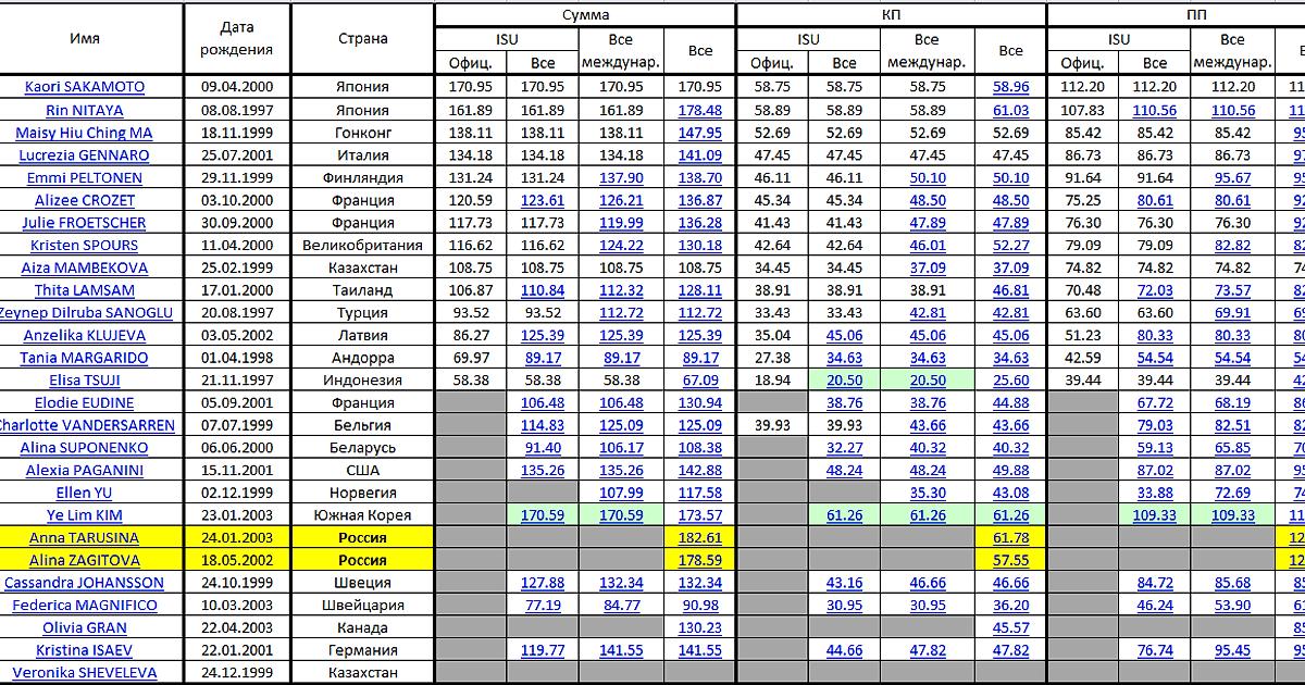 Результаты без гиперссылок - официальные рекорды фигуристов, внесенные в их профили на сайте ISU.