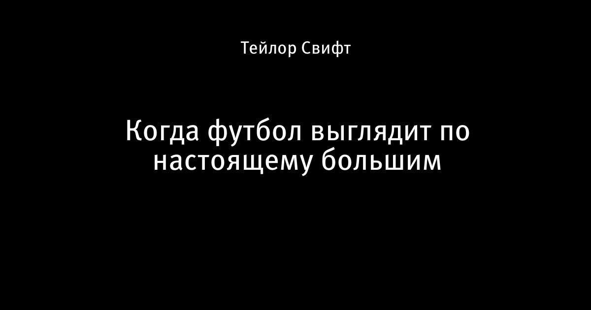 29 августа 2016, 22:16 Когда футбол выглядит по настоящему большим 1 Автор Тейлор Свифт Этот пост опубликован в блоге на Трибуне Sports.ru. Присоединяйтесь к крупнейшему сообществу спортивных болельщиков! Другие посты блога Тейлор Свифт болельщики