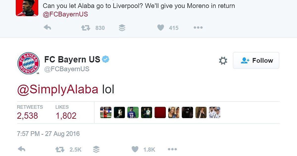 31 августа 2016, 12:40 Твиттер «Баварии» отреагировал на идею обмена Алабы на Морено Автор Тейлор Свифт Этот пост опубликован в блоге на Трибуне Sports.ru. Присоединяйтесь к крупнейшему сообществу спортивных болельщиков! Другие посты блога Тейлор Свифт Ливерпуль Альберто Морено Бавария Давид Алаба