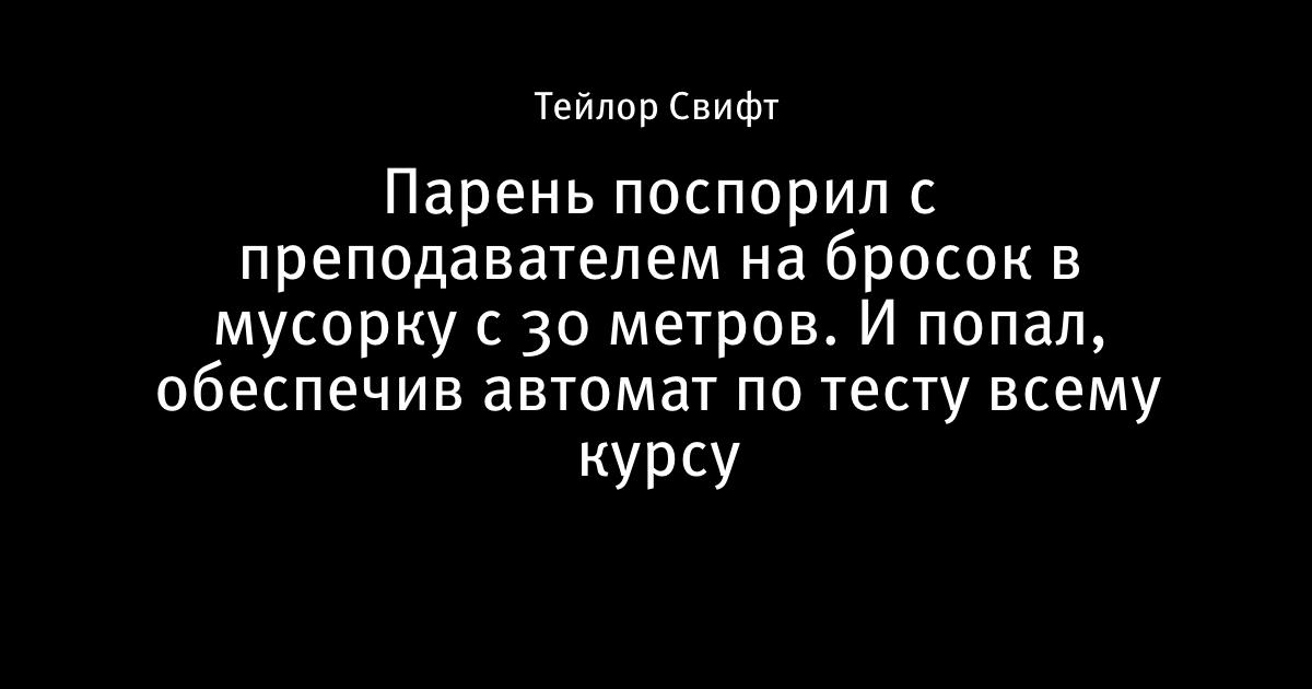 4 сентября 2016, 17:17 Парень поспорил с преподавателем на бросок в мусорку с 30 метров. И попал, обеспечив автомат по тесту всему курсу 1 Автор Тейлор Свифт Этот пост опубликован в блоге на Трибуне Sports.ru. Присоединяйтесь к крупнейшему сообществу спортивных болельщиков! Другие посты блога Тейлор Свифт