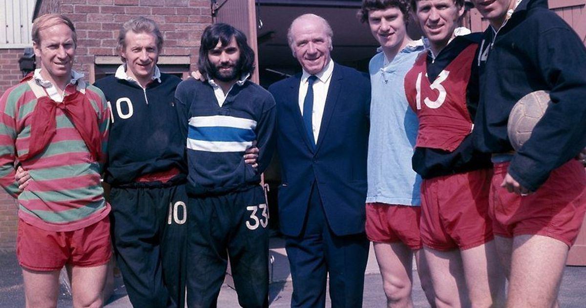 Манчестер Юнайтед 1971: Бобби Чарльтон,Денис Лоу,Джордж Бест,Сэр Мэтт Басби,Брайан Кидд,Пэт Креранд и Дэвид Сэдлер.