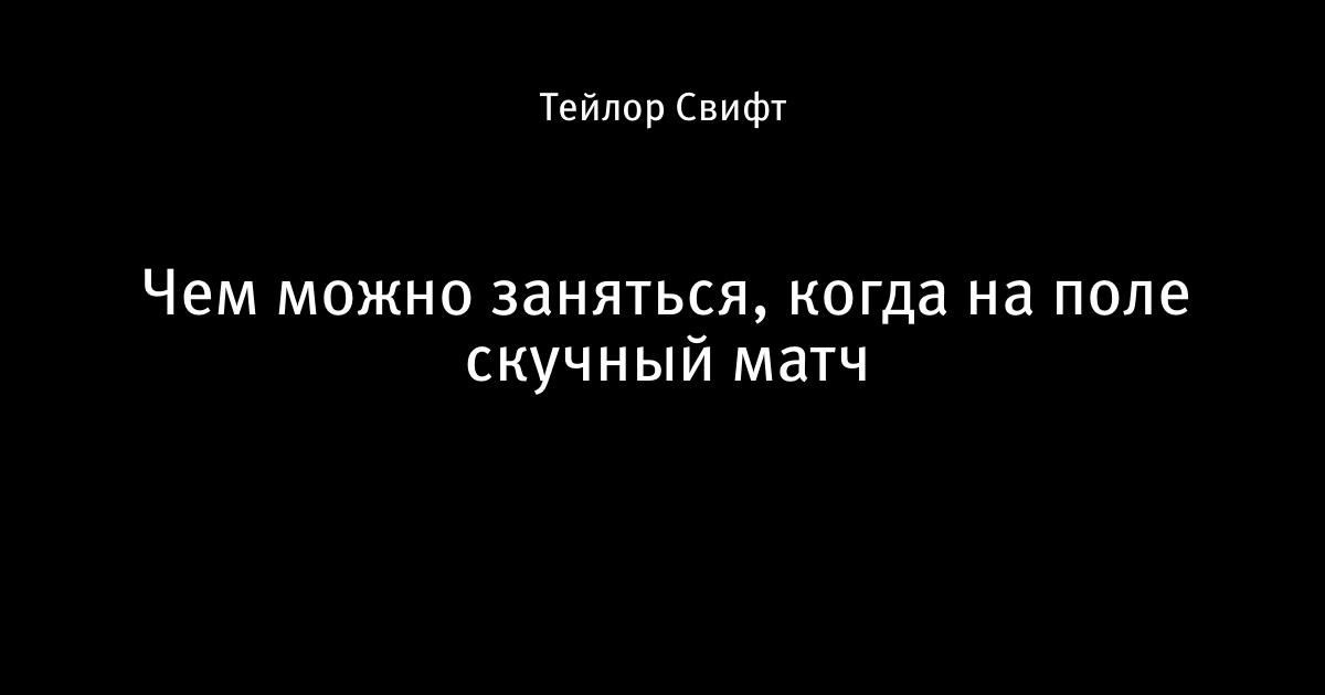 7 сентября 2016, 21:46 Чем можно заняться, когда на поле скучный матч 1 Автор Тейлор Свифт Этот пост опубликован в блоге на Трибуне Sports.ru. Присоединяйтесь к крупнейшему сообществу спортивных болельщиков! Другие посты блога Тейлор Свифт болельщики