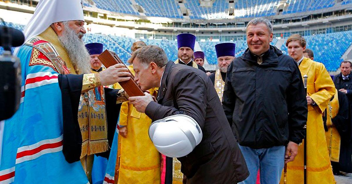 «Во время молебна была освящена Державная икона Божией Матери, которая впоследствии будет храниться в одном из помещений стадиона», – отметили в РПЦ.