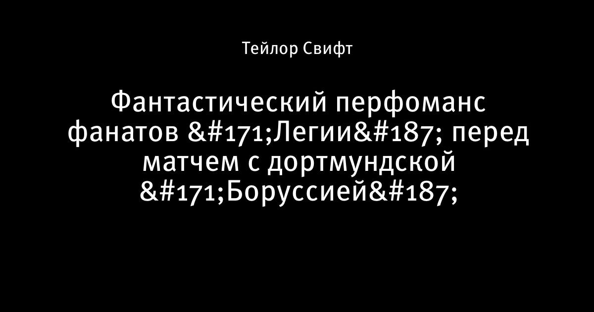 14 сентября 2016, 22:21 Фантастический перфоманс фанатов «Легии» перед матчем с дортмундской «Боруссией» Автор Тейлор Свифт Этот пост опубликован в блоге на Трибуне Sports.ru. Присоединяйтесь к крупнейшему сообществу спортивных болельщиков! Другие посты блога Телевизор 3.0 Боруссия Дортмунд Лига чемпионов УЕФА Легия