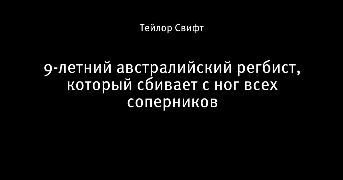 15 сентября 2016, 10:32 9-летний австралийский регбист, который сбивает с ног всех соперников Автор Тейлор Свифт Этот пост опубликован в блоге на Трибуне Sports.ru. Присоединяйтесь к крупнейшему сообществу спортивных болельщиков! Другие посты блога Тейлор Свифт