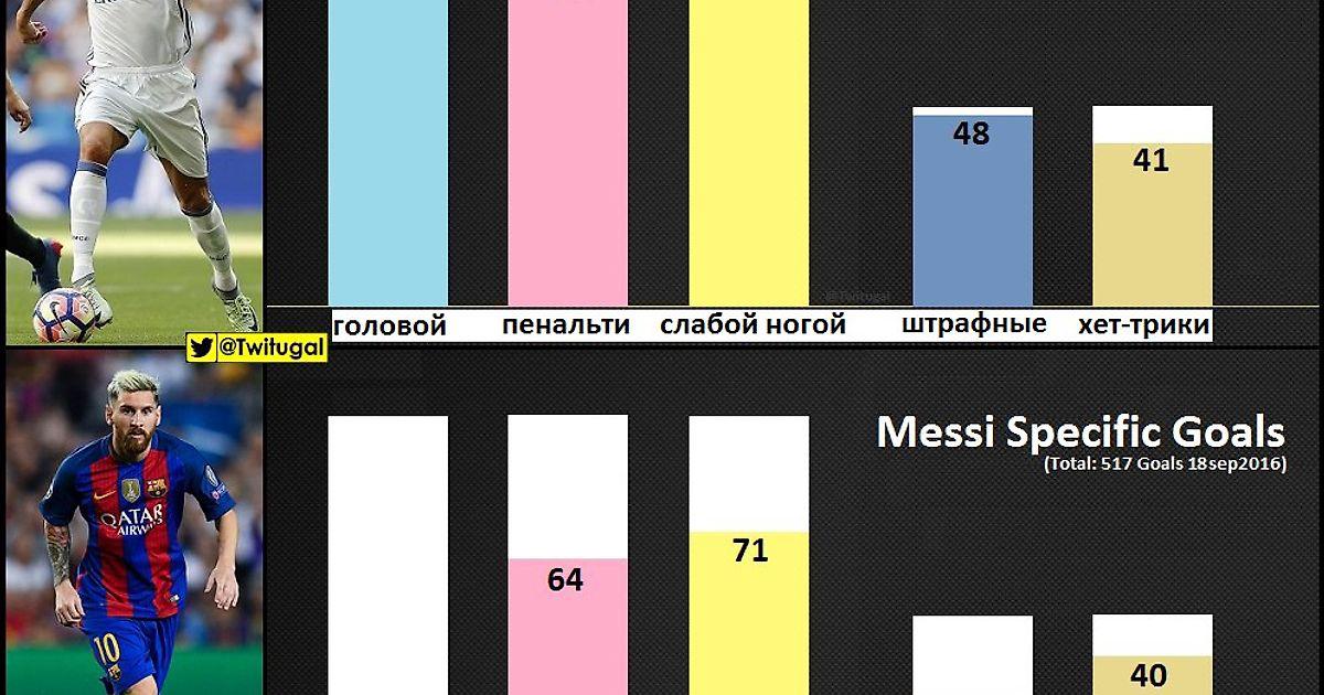 на 33 гола отстает, а играл нав 150 матчей меньше, где то по его статистике - то 200очей г+п минимум, а так 100 голов думаю за 150 матчей в Месси по силе без вопросов...а 100голов то полюс 3-4 хет=трика, еще с 15-20 слабой ногой, плюс 10-15штрафних то минимум, ( и да штрафние Месси тоже не сразу бил, а РОн их еще с МЮ пулял ), а если брать в процентах сколько ударов со штрафних ударил первий и второй..там пропасть, ну правда головой не догонит Месси ни как. ЕЩе предлагаю сделайте обзор, сколько Месси забил сильной при том обошел 4 или 5, сколько в Роналду таких феноменальних голов?...хаха.