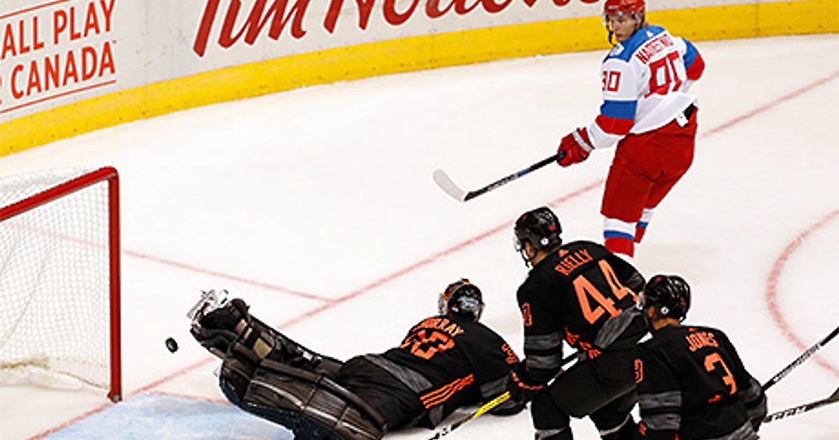 На 30-й минуте матча со сборной Северной Америки U23 игрокам четвертого звена удалась отличная (редкое явление к тому моменту) атака. Только вот Мэтт Мюррей справился с броском Ивана Телегина, а добивание Владислава Наместникова пришлось в штангу. Впрочем, оттолкнувшись от штанги, шайба встретилась с щитком голкипера, а затем с его же помощью отправилась в ворота.