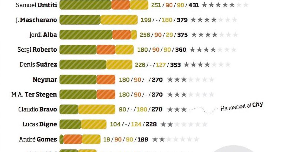 Количество сыгранных минут игроками Барселоны в этом сезоне
