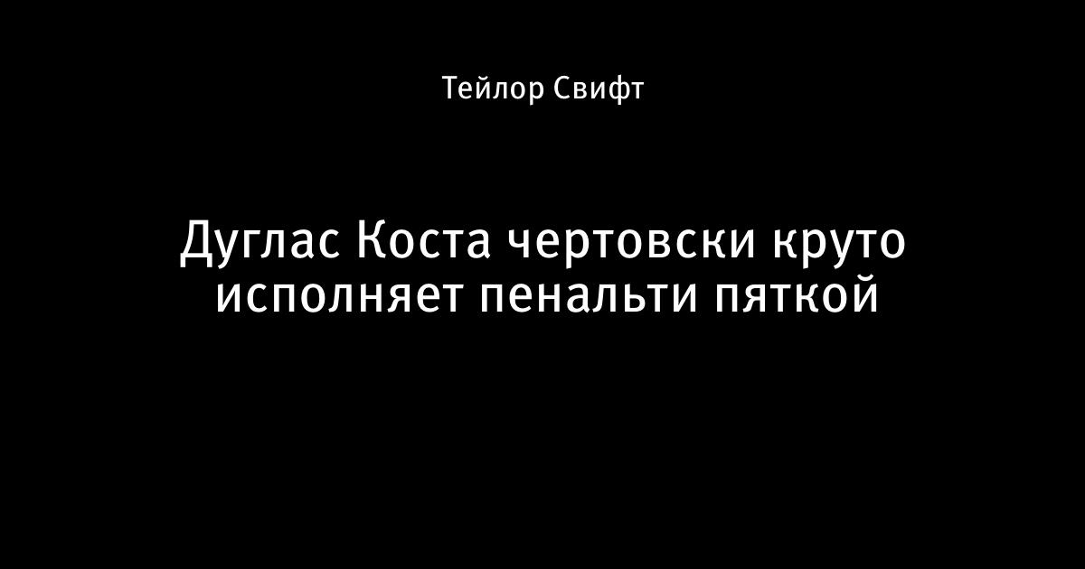 22 сентября 2016, 09:31 Дуглас Коста чертовски круто исполняет пенальти пяткой Автор Тейлор Свифт Этот пост опубликован в блоге на Трибуне Sports.ru. Присоединяйтесь к крупнейшему сообществу спортивных болельщиков! Другие посты блога Тейлор Свифт Бавария Дуглас Коста