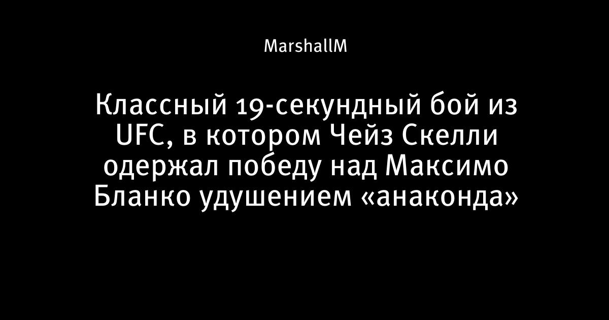 22 сентября 2016, 10:52 Классный 19-секундный бой из UFC, в котором Чейз Cкелли одержал победу над Максимо Бланко удушением «анаконда» Судья, возможно, немного промедлил с решением остановить бой Автор MarshallM Этот пост опубликован в блоге на Трибуне Sports.ru. Присоединяйтесь к крупнейшему сообществу спортивных болельщиков! Другие посты блога Вы это видели? UFC