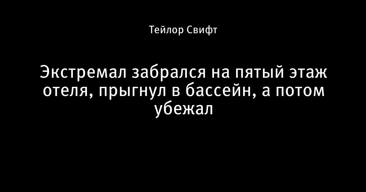 22 сентября 2016, 15:04 Экстремал забрался на пятый этаж отеля, прыгнул в бассейн, а потом убежал Автор Тейлор Свифт Этот пост опубликован в блоге на Трибуне Sports.ru. Присоединяйтесь к крупнейшему сообществу спортивных болельщиков! Другие посты блога Телевизор 3.0