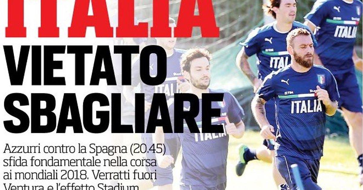 Квалификация Чемпионата Мира: этим вечером в Турине игра с Испанией. В борьбе за первенство в группе, которое даёт прямой доступ в Россию в 2018. Вентура: «Здесь я всегда проигрывал, но в этот раз играю дома». Лопетеги отказывается от Мораты. Буффон: «Я счастлив…».