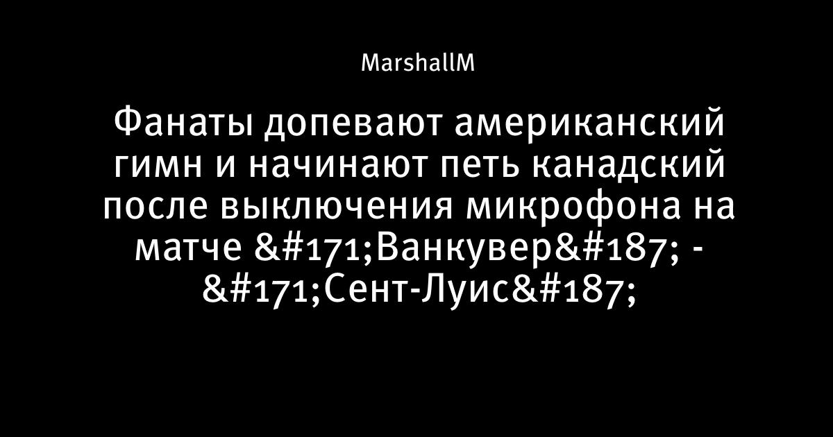19 октября 2016, 10:47 Фанаты допевают американский гимн и начинают петь канадский после выключения микрофона на матче «Ванкувер» - «Сент-Луис» Автор MarshallM Этот пост опубликован в блоге на Трибуне Sports.ru. Присоединяйтесь к крупнейшему сообществу спортивных болельщиков! Другие посты блога Вы это видели? Ванкувер НХЛ болельщики Сент-Луис