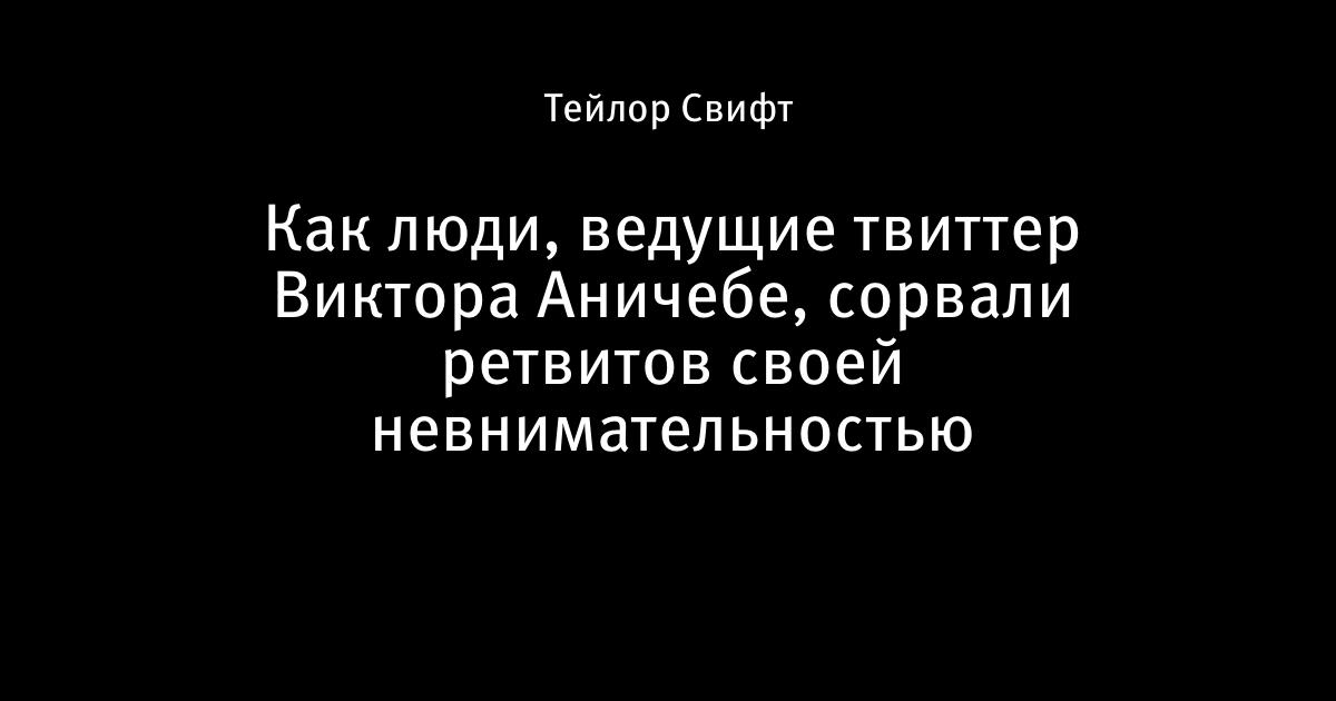 23 октября 2016, 18:27 Как люди, ведущие твиттер Виктора Аничебе, сорвали ретвитов своей невнимательностью «Невероятная поддержка...» Когда вместо твита о матче публикуют копипаст задания. Автор Тейлор Свифт Этот пост опубликован в блоге на Трибуне Sports.ru. Присоединяйтесь к крупнейшему сообществу спортивных болельщиков! Другие посты блога Тейлор Свифт премьер-лига Англия Сандерленд Виктор Аничебе