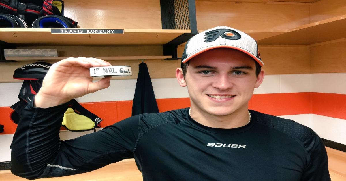 Таким образом, в седьмом матче за "Филадельфию" Трэвису удалось забить свою первую шайбу в НХЛ.