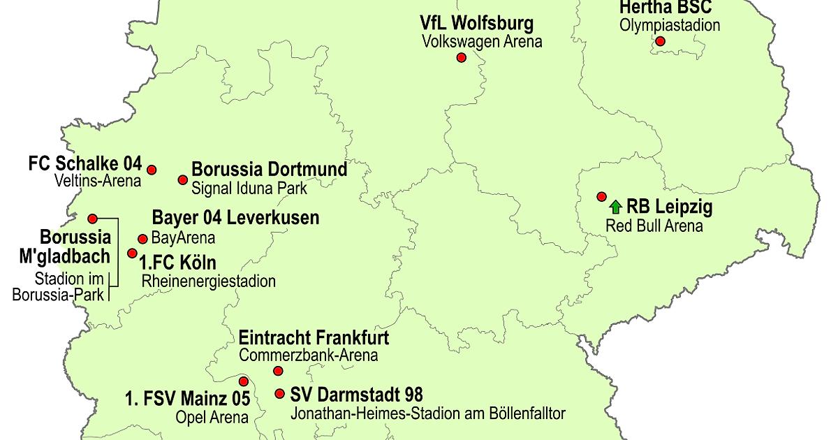 Самая "густонаселенная" федеральная земля - Северный Рейн-Вестфалия (столица - Дюссельдорф, самый крупный город - Кёльн), где располагаются 2 Боруссии, Шальке, Кёльн и Байер. Далее следует Бавария с клубами Бавария Мюнхен, Аугсбург и Ингольштадт. Здесь необходимо обратить внимание на то, что сама Бавария делится на несколько регионов - Верхняя Франкония, Средняя Франкония, Нижняя Франкония, Верхний Пфальц, Нижняя Бавария, Верхняя Бавария и Швабия. К последнему относится Аугсбург, а Ингольштадт и Бавария располагаются в Верхней Баварии, где Мюнхен самый крупный город земли, а Ингольштадт занимает второе место. По два клуба имеют Баден-Вюртемберг (Фрайбург, Хоффенхайм, а также Штутгарт, покинувший Бундеслигу в этом году), Гессен (Дармштадт, Айнтрахт Франкфурт).