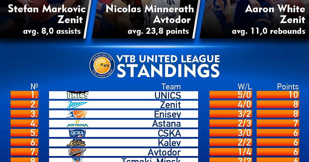 Единая лига ВТБ ведёт турнирную таблицу по правилам ФИБА, согласно которым за победу даётся 2 очка, а за поражение - 1. Таким образом, из-за разницы в количестве сыгранных матчей возникают некоторые перекосы, как НН, не одержавший ни одной победы из четырёх возможных, оказался выше "Химок", сыгравших только 2 матча, в одном из который они победили. Тем не менее, игнорировать существование таблицы было бы странно, и согласно ей "Зенит", пока что не знающий поражений в Единой Лиге, оказался на второй строчке. Not bad.